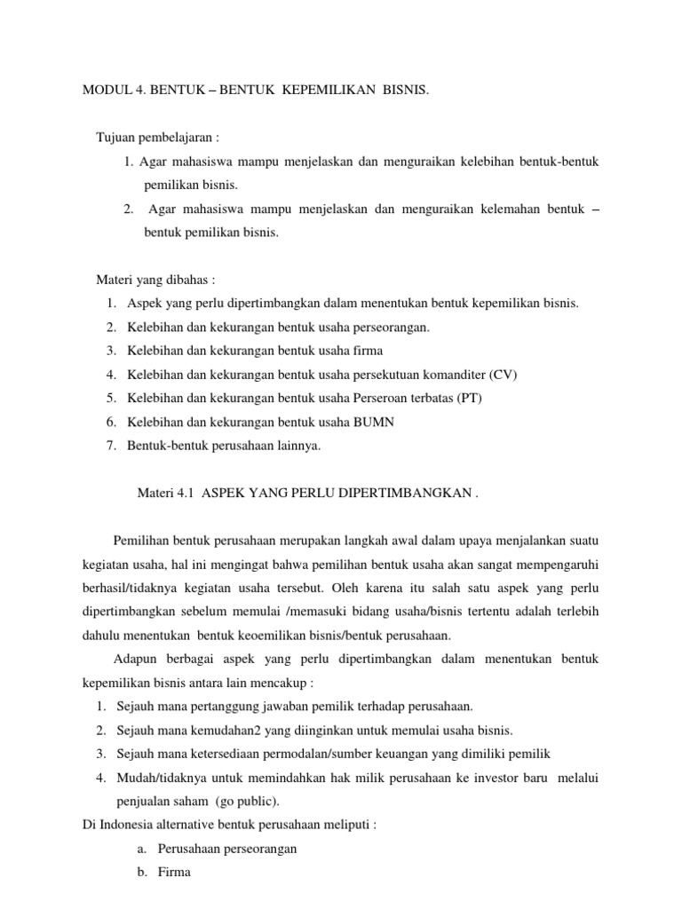 Bentuk kepemilikan bisnis antara lain : Kepemilikan organisasi bisnis bentuk bisnis kewajiban kontinuitas manajemen sumber dana perusahaan perseorangan pribadi, tidak terbatas berakhir dgn kematian/ keputusan pemilik pribadi, tidak terbatas pribadi persekutuan pribadi, tidak terbatas berakhir dengan kematian/ keputusan anggota tidak terbatas, sesuai kesepakatan If you're not happy with the results, please do another search.
