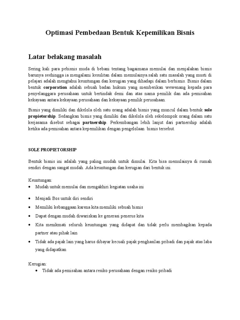 Bentuk kepemilikan bisnis ada yang dikatakan berbentukbadan hukum dan tidak berbadan hukum. Makalah bentuk bentuk kepemilikan bisnis kami ditujukan untuk melengkapi dan menyelesaikan tugas yang diembankan kepada kami oleh bapak ansir launtu selaku pengampu matakuliah pengantar bisnis. Usaha yang tidak berbentuk badan hukum ialah: