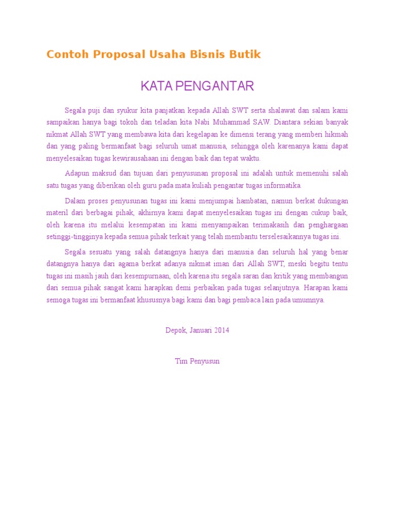 Sebagaimana halnya ilmu bisnis dan sosial, cara pembuatan bisnis plan atau proposal bisnis bukanlah sesuatu yang saklek dan kaku. Kata pengantar segala puji dan syukur kita panjatkan kepada allah swt serta shalawat dansalam kami sampaikan hanya bagi tokoh dan teladan kita nabi muhammad saw.diantara sekian banyak nikmat allah swt yang membawa kita dari kegelapan kedimensi terang yang memberi hikmah dan yang paling bermanfaat bagi seluruhumat manusia, sehingga oleh karenanya kami dapat. Kebutuhan akan sandang merupakan kebutuhan primer setiap orang.