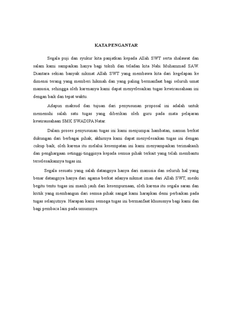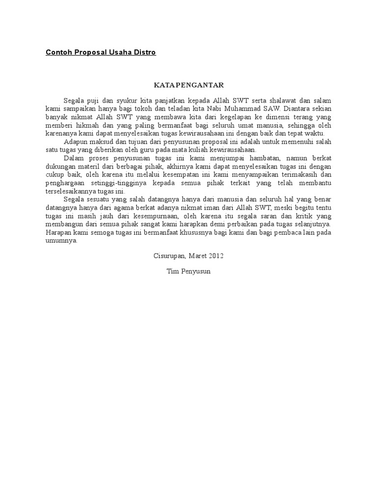 Diantara sekian banyak nikmat allah swt yang membawa kita dari kegelapan ke dimensi terang yang memberi hikmah dan yang paling bermanfaat. Berikut ini contoh proposal bisnis distro yang harus mencakup beberapa bagian penting. Page | 1 kata pengantar segala puji dan syukur kita panjatkan kepada allah swt serta shalawat dan salam kami sampaikan hanya bagi tokoh dan teladan kita nabi muhammad saw.