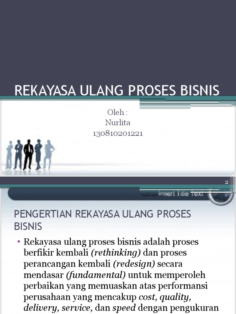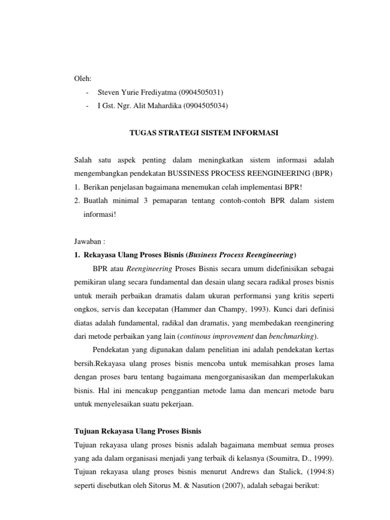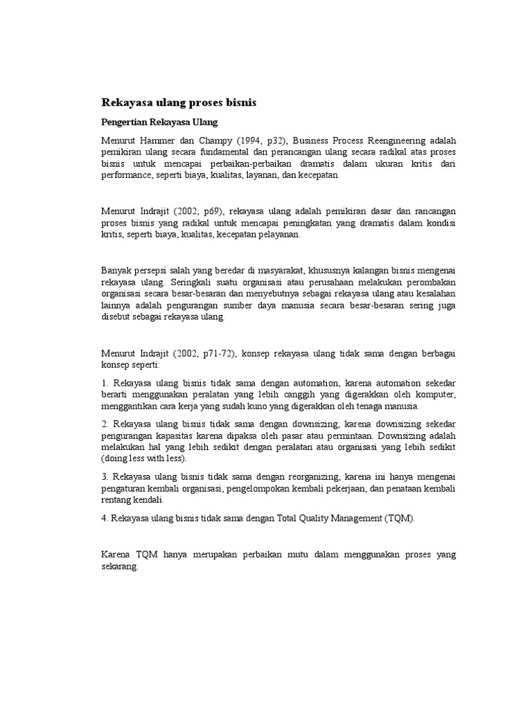Teknologi informasi, aliran data, proses bisnis, rekayasa ulang. Rekayasa ulang proses bisnis (business process reengineering/bpr) melibatkan disain ulang radikal terhadap proses bisnis inti untuk mencapai perbaikan dramatis dalam produktivitas, waktu siklus dan kualitas.dalam bpr, perusahaan mulai dengan selembar kertas kosong dan memikirkan ulang proses yang ada untuk memberikan nilai lebih kepada pelanggan. Reengineering atau rekayasa ulang adalah perancangan ulang secara pada proses bisnis yang berjalan saat ini dengan penekanan pada pengurangan biaya dan waktu siklus agar terjadi peningkatan kepuasan pelanggan.